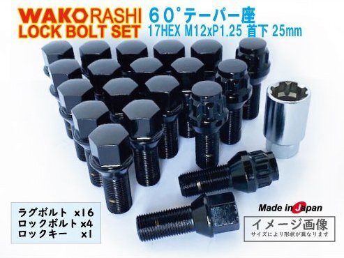 - 日本製 ロックボルトセット 5穴 1台分 60°テーパー座 M12xP1.25 首下25mm ブラック 和広ボルト16個とロックボルトのセット プジョー