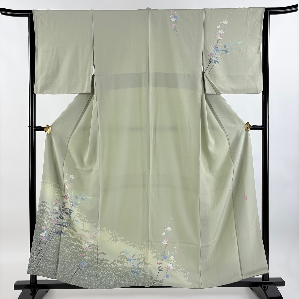 - 訪問着 身丈157.5cm 裄丈64cm M 袷 落款 草花 松 灰緑 正絹 秀品 【中古】
