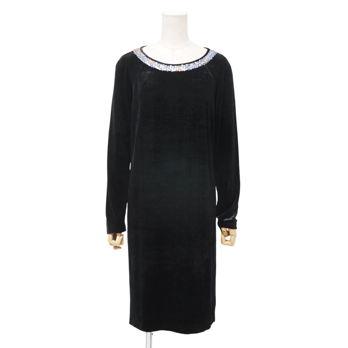 - MI0050》イタリア製 ミッソーニ MISSONI【vintage】ベルベッド ワンピース スパンコール装飾 クルーネック 長袖 膝丈 サイズ44 ブラック系