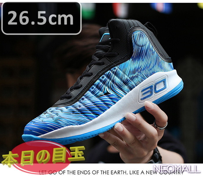 > 1スタ ☆ メンズ スニーカー 26.5cm ブラック × ブルー 靴 シューズ 防滑 バスケットシューズ 通勤 通学 旅行 【818】