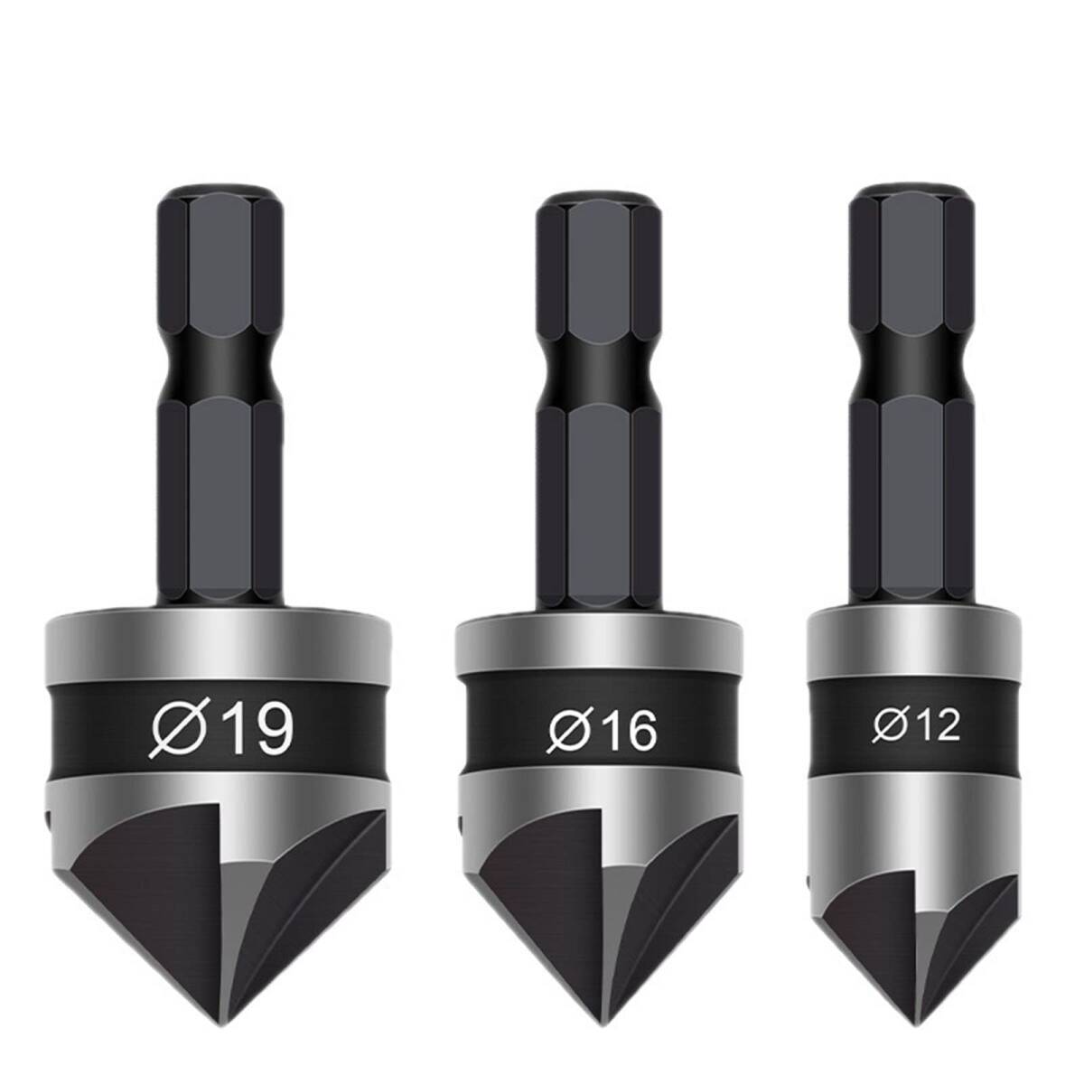 - 3本セット 皿取り錐ドリル 面取りカッター ビット カウンターシンク 座ぐり バリ取り 六角軸 6.35mm 5枚刃 ドリルビット