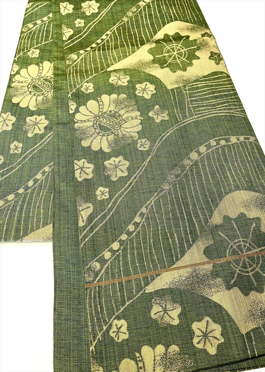 > 花とら●リサイクル帯 袋帯 緑 モダン 楓 洒落帯 250404