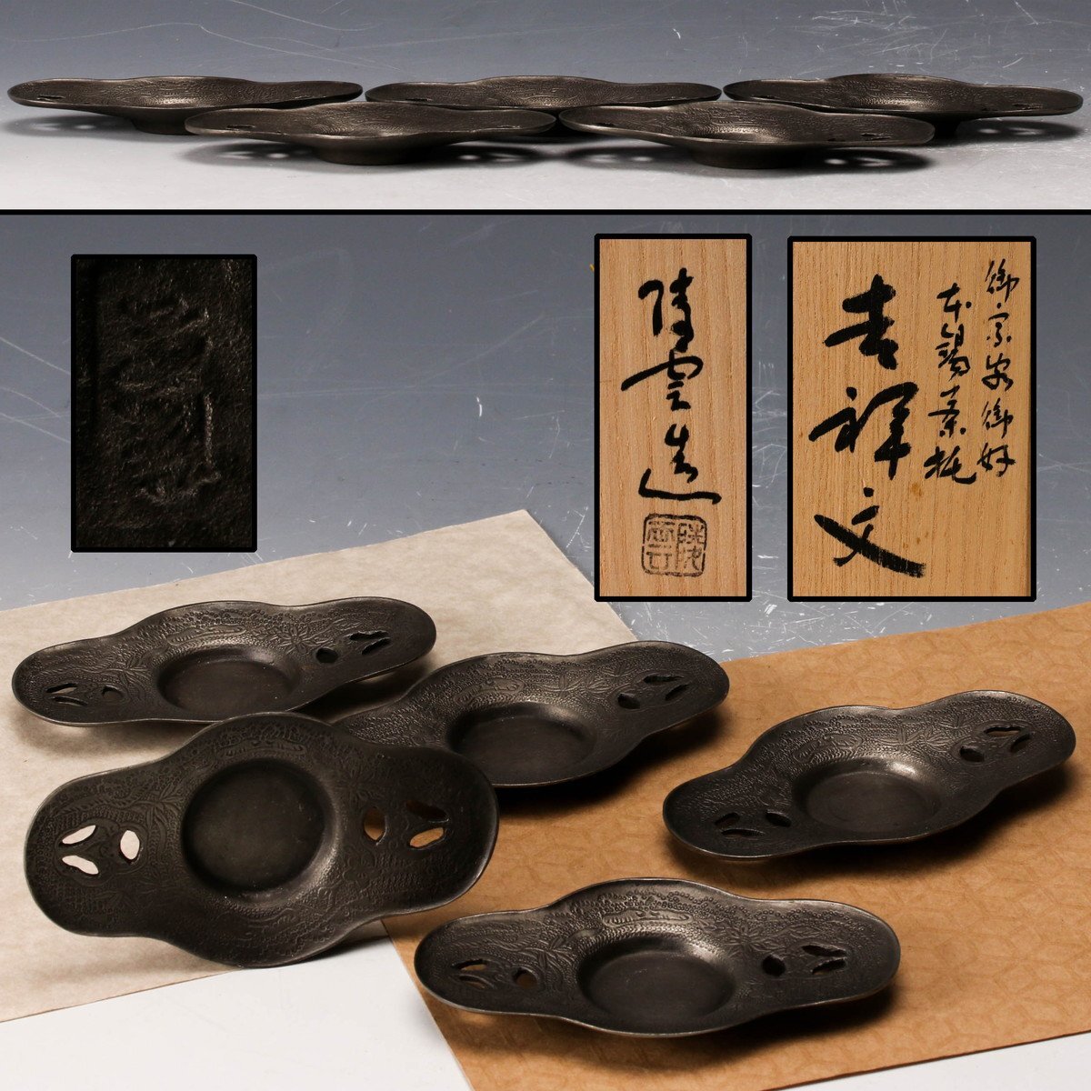 【佳香】高井陵雲 御宗家御好 本錫茶托 吉祥紋 五客 共箱 茶道具 本物保証