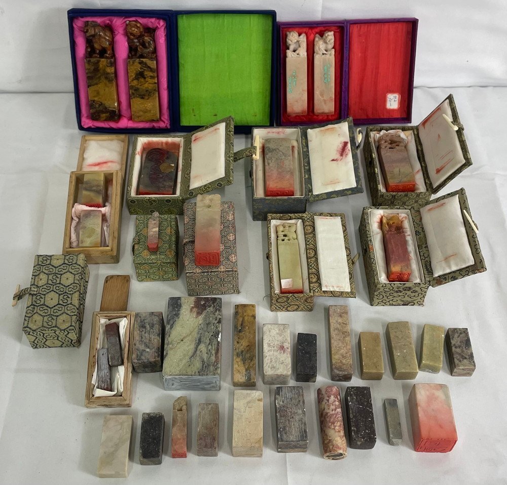 - 【8PZ007】印材 大量まとめ 約3.7㎏ 印鑑 角印 天然石 獅子彫 箱付 中国古玩 唐物 書道具 骨董 古美術品 趣味 コレクション 現状品