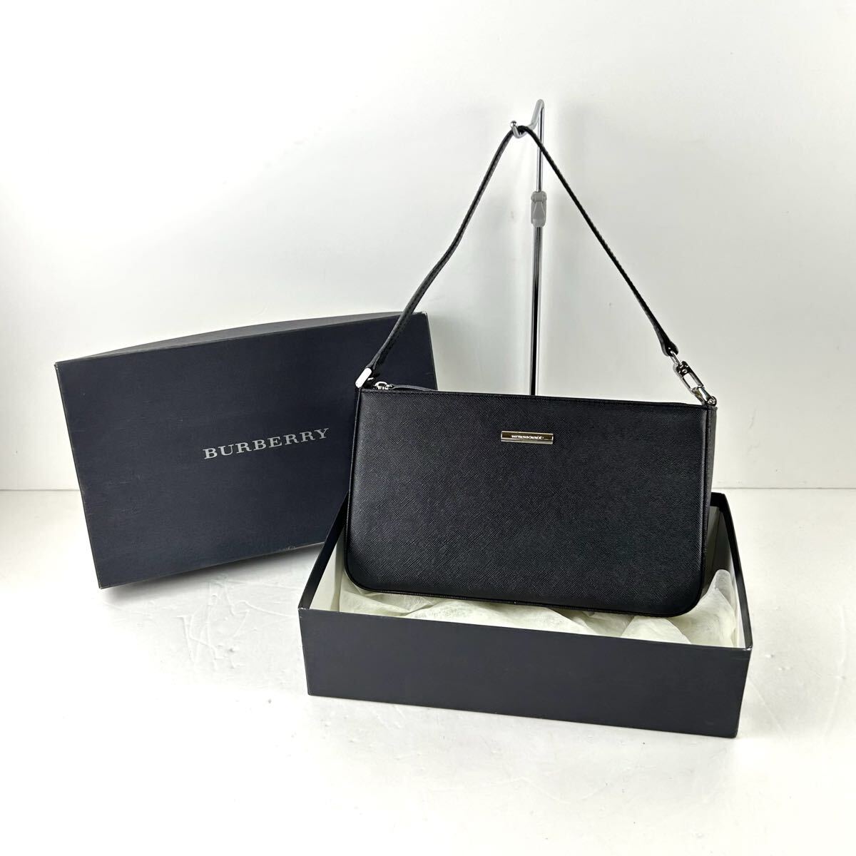 - 【SY390】美品 BURBERRY バーバリー バッグ ワンショルダーバッグ ハンドバッグ ロゴプレート ブラック 黒レザー シルバー金具 鞄 箱付