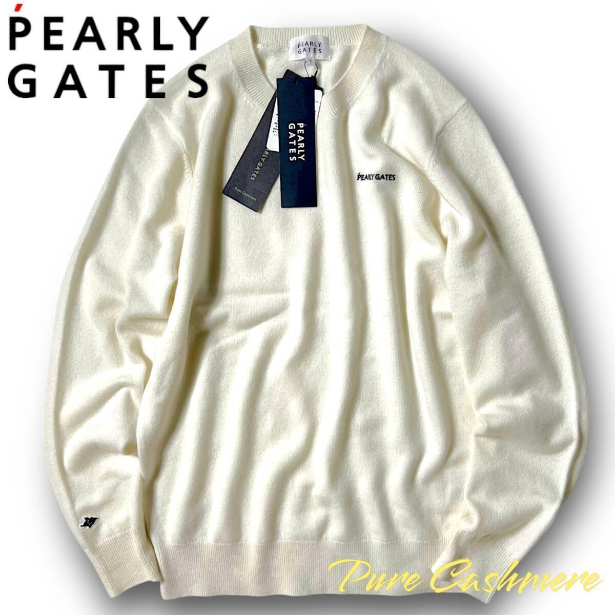 > 新品 PEARLY GATES パーリーゲイツ 定価3.3万 ピュアカシミヤ ロゴ刺繍 長袖 クルーネック ニット セーター プルオーバー 1 M 秋冬 ◆C564