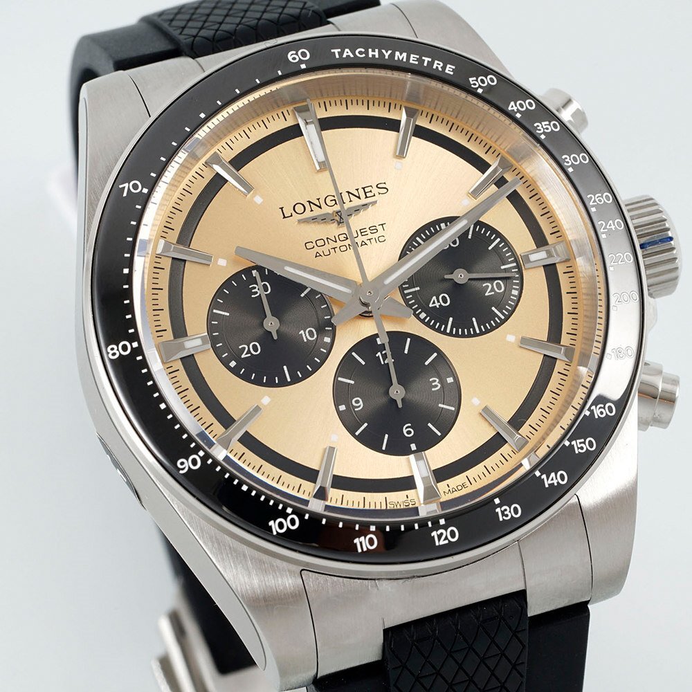 - LONGINES ロンジン Conquest Chronograph 腕時計 メンズ ウォッチ 自動巻き ラバーベルト 紳士 ゴールド文字盤 L3.835.4.32.9