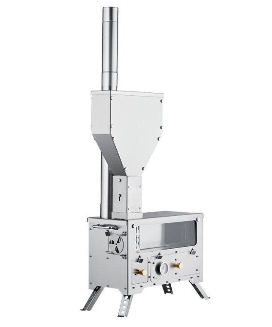 - 薪ストーブ ペレットストーブ 自己吸入・排煙 多機能ストーブ オーブン ガラス窓 炉脚折りたたみ収納 煙突付き 暖炉 アウトドア キャンプ