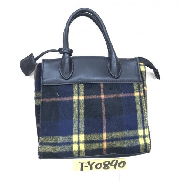 - レディース チェックファー ミニハンドバッグ 紺黄色黒