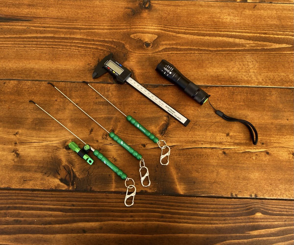 - クワガタかき出し棒 オリジナルロゴ入りライト付き掻き出し棒 メタリックグリーン デジタルノギス LED懐中電灯 ハンドメイド