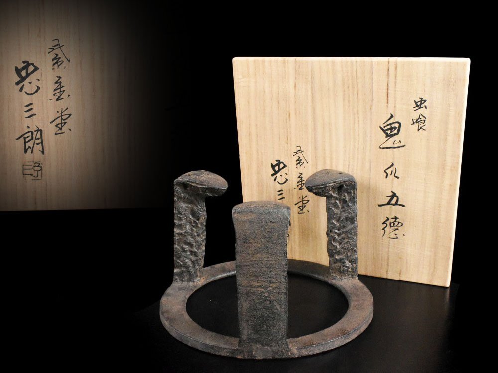 - 【雲】某名家買取品 釜師名人 紫金堂 加藤忠三郎 和鉄 虫喰鬼爪五徳 共箱 古美術品(煎茶道具瓶掛風炉)CJ1664 LT2gde45
