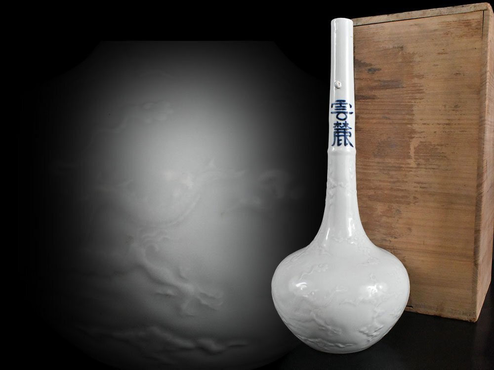> 【雲】某資産家買取品 中国美術 白磁 陽刻雲龍紋鶴首花瓶 高さ48.5cm 箱付 古美術品(花器花入飾壺)BJ1854 UTUvgf NBlkiu