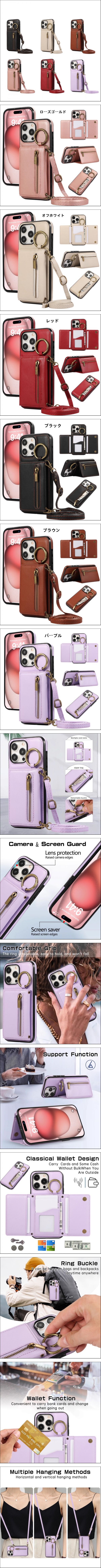 > iPhone17 (6.3インチ) ケース 三つ折り 指リング付き ラウンドジップ カード収納 斜め掛け ロングストラップ スマホカバー 防 保護カバー