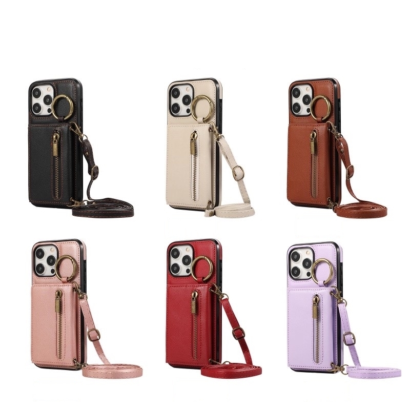 - iPhone17 (6.3インチ) ケース 三つ折り 指リング付き ラウンドジップ カード収納 斜め掛け ロングストラップ スマホカバー 防 保護カバー