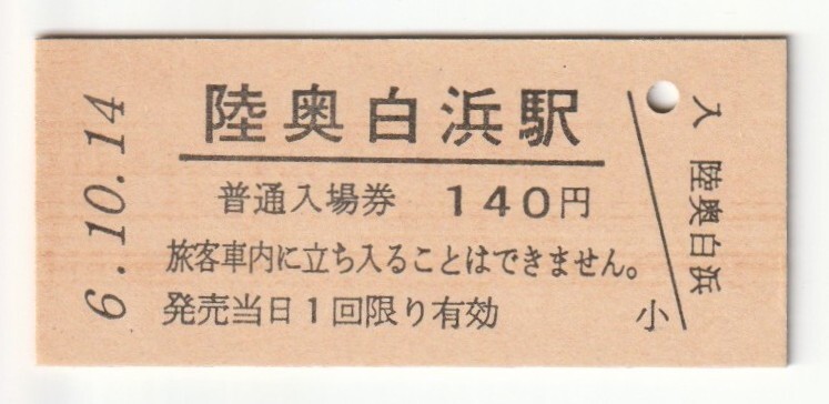 - 平成6年10月14日 八戸線 陸奥白浜駅 140円硬券普通入場券(日付印刷)
