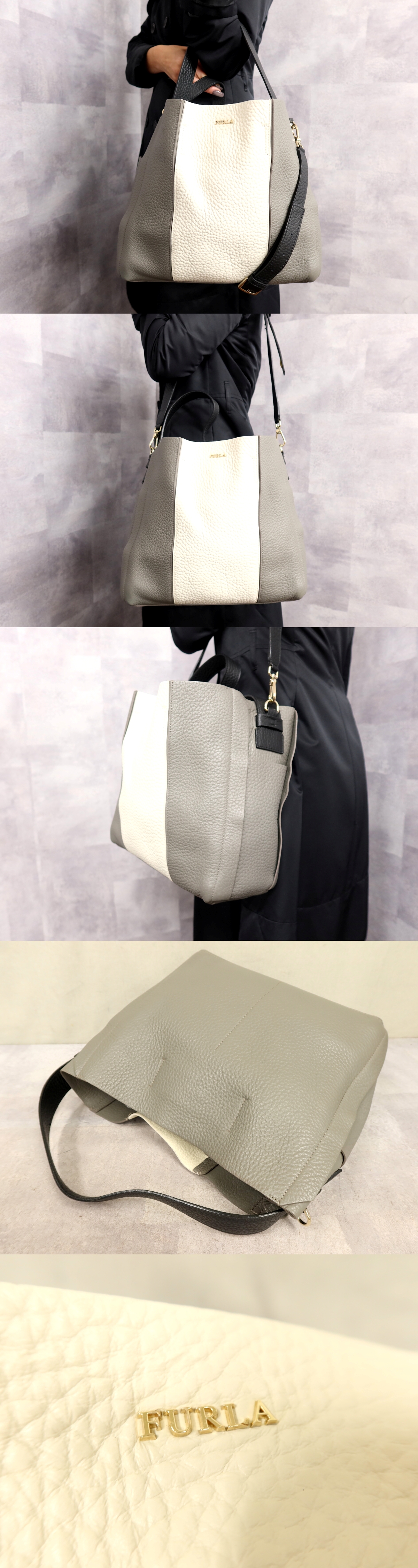 > ●超美品●FURLA フルラ●カプリッチョ●カーフ レザー 本革●2way トート バッグ●グレー オフホワイト 黒●G金具●A4 書類 収納●Js61881