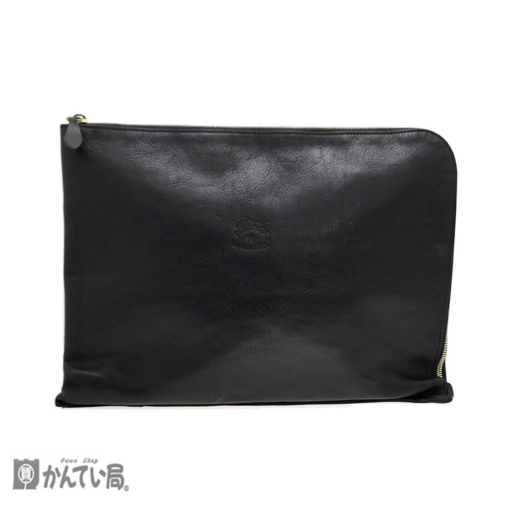 - IL BISONTE イルビゾンテ L字 ファスナー開閉 クラッチバッグ セカンドバッグ レザー ブラック 黒 マチ無し シンプル ポケット多数 布袋有