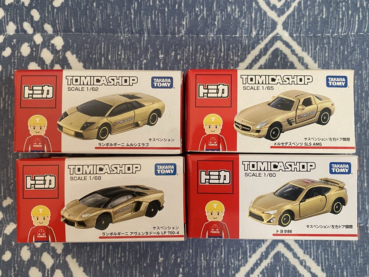 - トミカショップ限定トミカ ゴールド色4種類まとめて ランボルギーニムルシエラゴ、アヴェンタドール、メルセデスベンツSLS AMG、トヨタ86