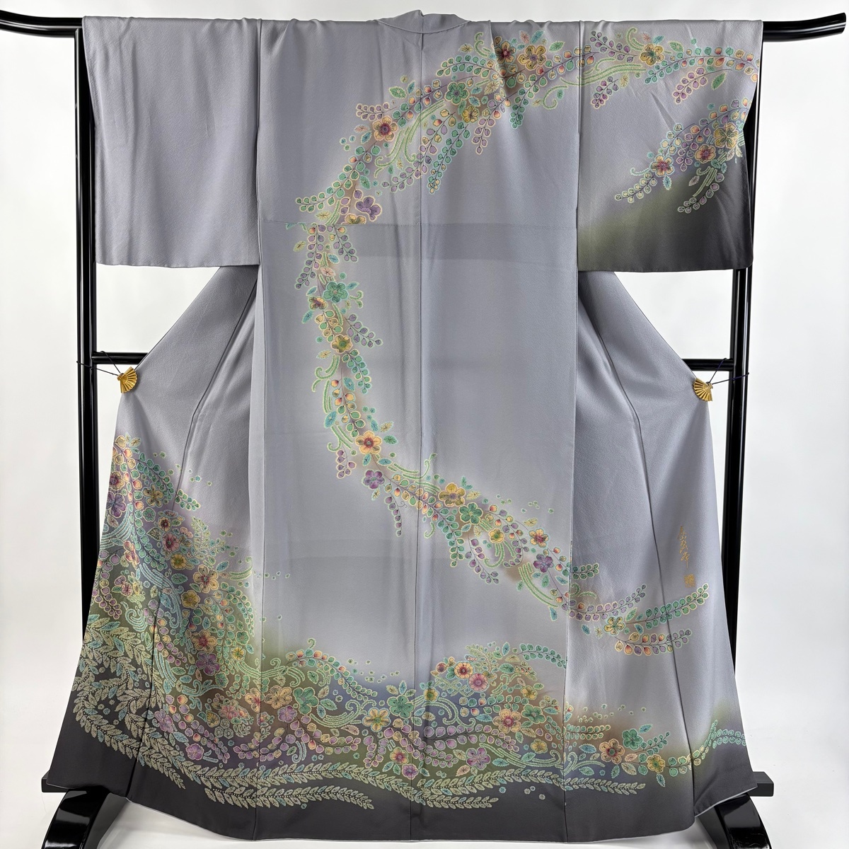 > 訪問着 身丈165.5cm 裄丈68cm L 袷 落款 草花 ぼかし 灰紫 正絹 秀品 【中古】