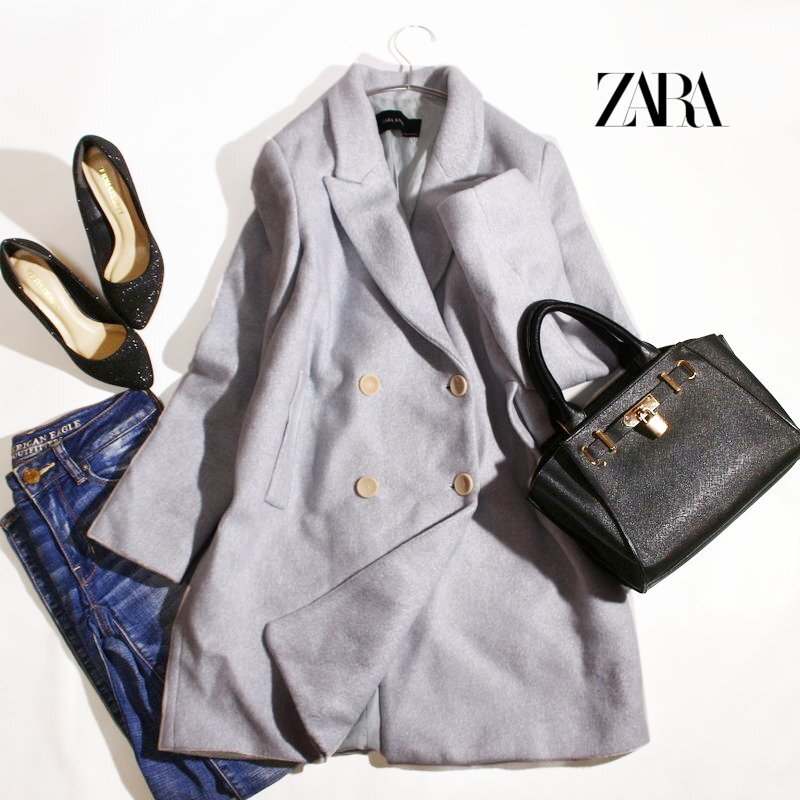 > 美品 厚手 ZARA BASIC ザラ ベーシック ふんわり ミックス ロングチェスターコート S くすみ 水色 ライトグレー ホワイト 白 コート