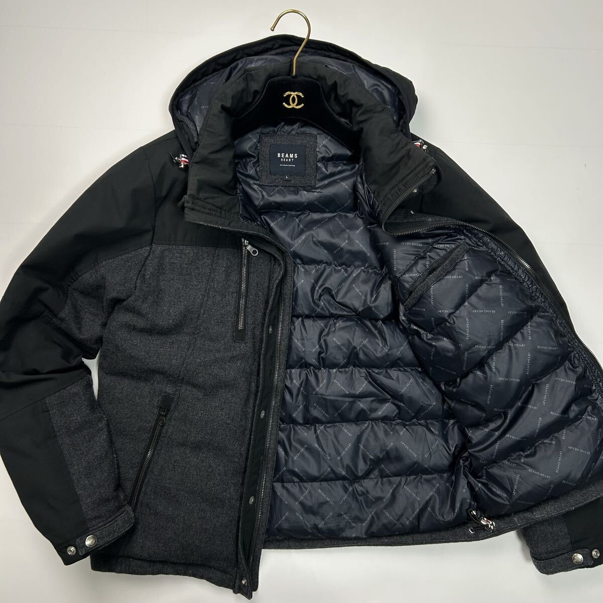 > 美品★ Lサイズ BEAMS HEART ダウン80% ビームス ハート ダウンジャケット 2way ウール フード 黒 ブラック ロゴ 総柄 生地切り替え 上着