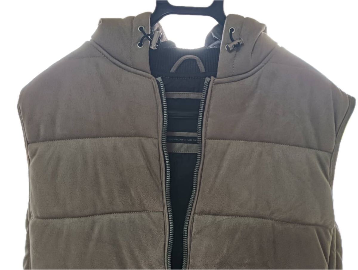 - ZARA MAN ツヤありキルティングベスト フード付き Lサイズ ダークオリーブ メンズ ジップアップ 美品