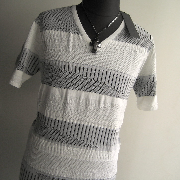 > 1.9万 新品 L トルネードマート ランダムキカボーダーリンクス半袖Vネックニット ホワイト 送料無料 サンプル 719