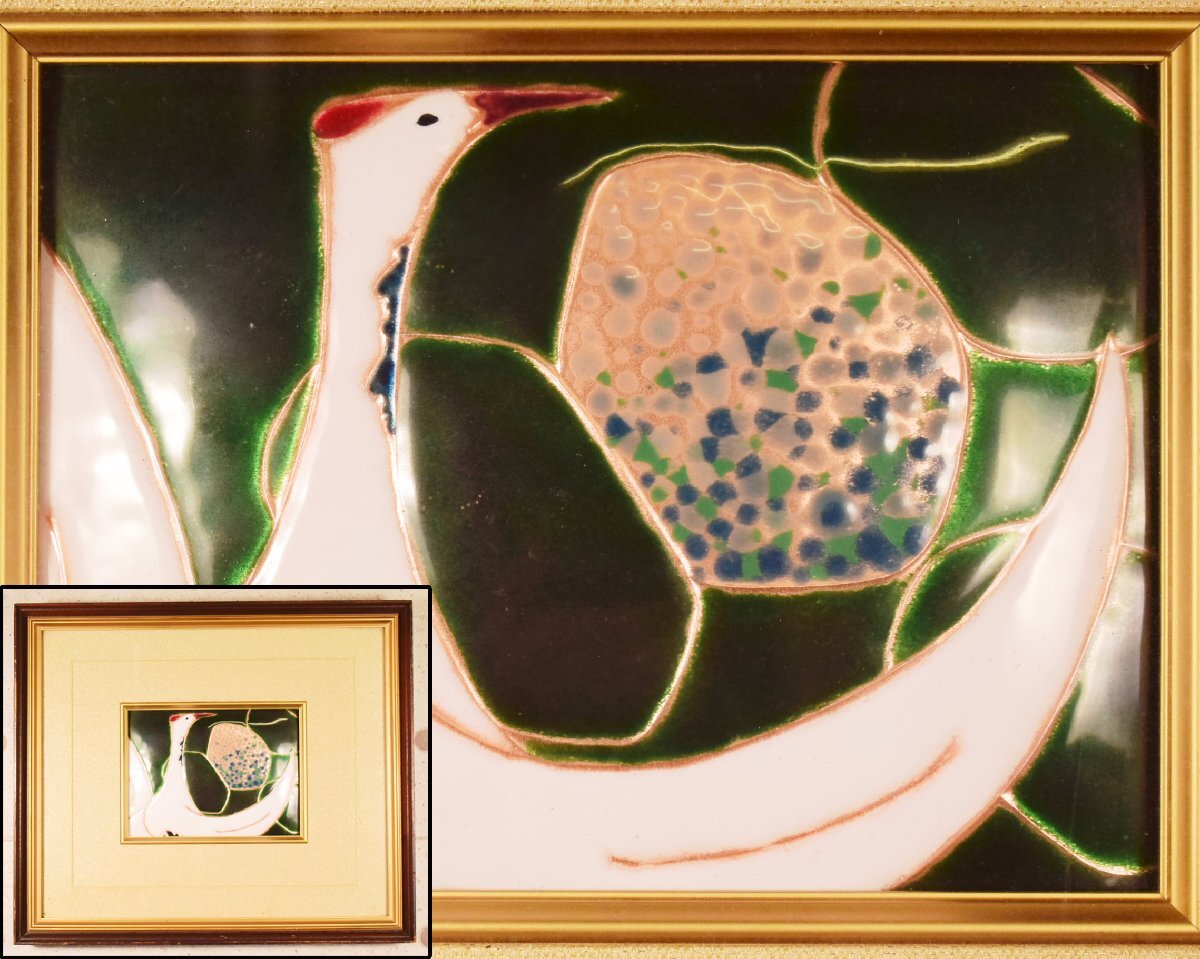 X642 【泉美】七宝焼 鶴画 額装 壁掛け アート拍卖