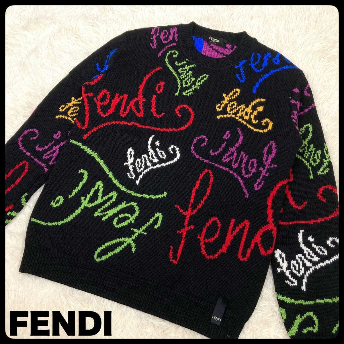 > FENDI フェンディ ニット セーター ウール100% 長袖 ロゴ 総柄 プルオーバー マルチカラー 厚手 イタリア製