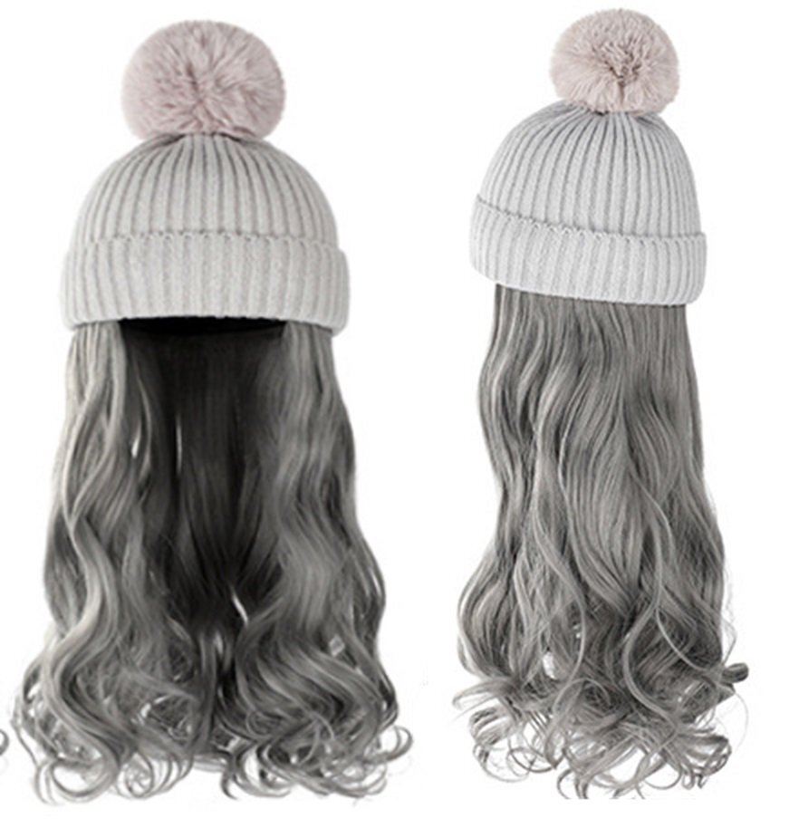 - ウィッグ付きニット帽 ニット帽/グレー ウィッグカラー/F ロングヘアー カール イメチェン 髪色チェンジ コスプレ n467