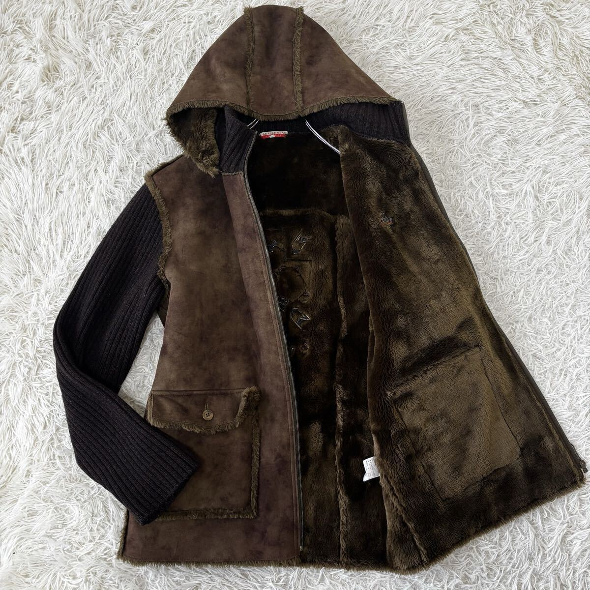 > 未使用◎稀少XL◎カステルバジャック『休日の1着』CASTELBAJAC 極暖ニット×フェイクムートン 刺繍クマ フード ボアジャケット 4 ブラウン