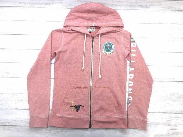 > ビラボン BILLABONG アメカジ サーフ ネイティブ柄ワッペン 袖プリント 霜降り ダブルジップ スウェットパーカー レディース M ピンク