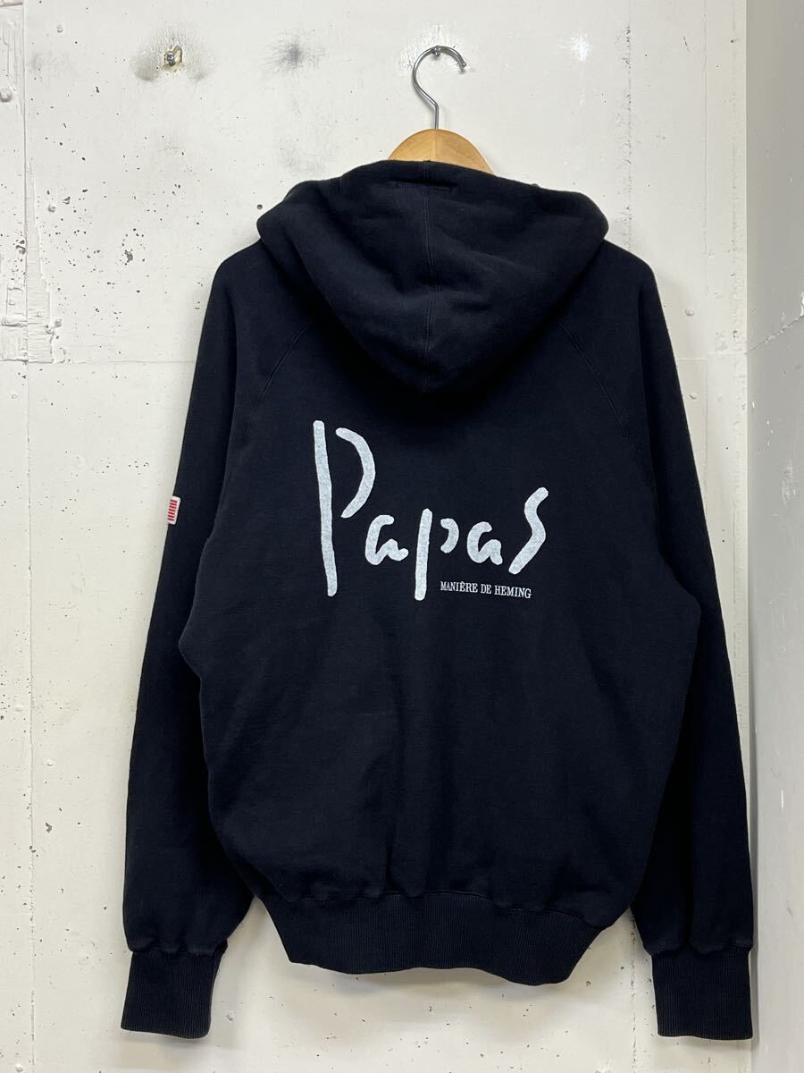 - PAPAS 豪華プリント ボタン スウェット パーカー 黒 M 日本製 パパス フード内プリント 袖ワッペン フードロゴ 前後ロゴプリント