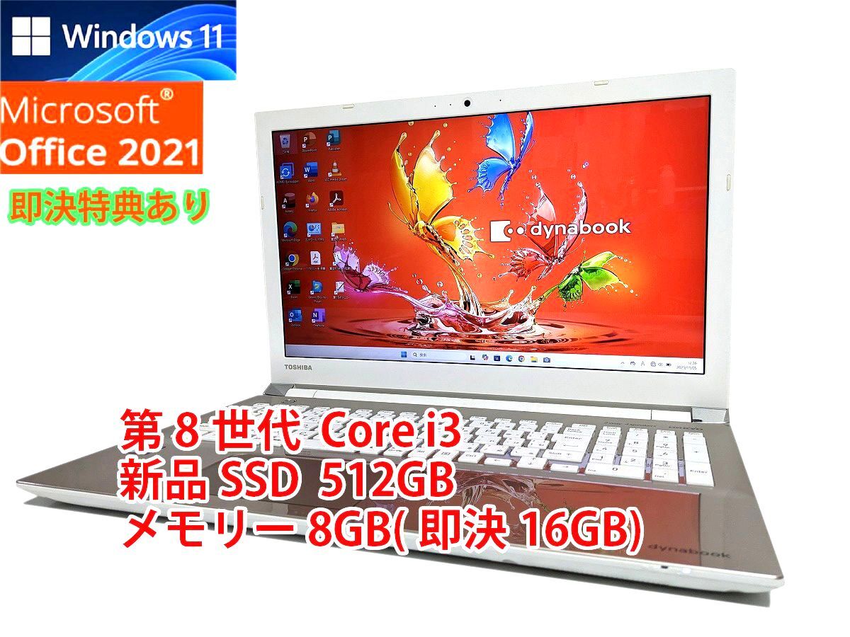 - 美品 すぐに使用可能 フルHD Windows11 Office2021 第8世代 Core i3 東芝 dynabook 新品SSD 512GB メモリ 8GB(即決16GB) 管848