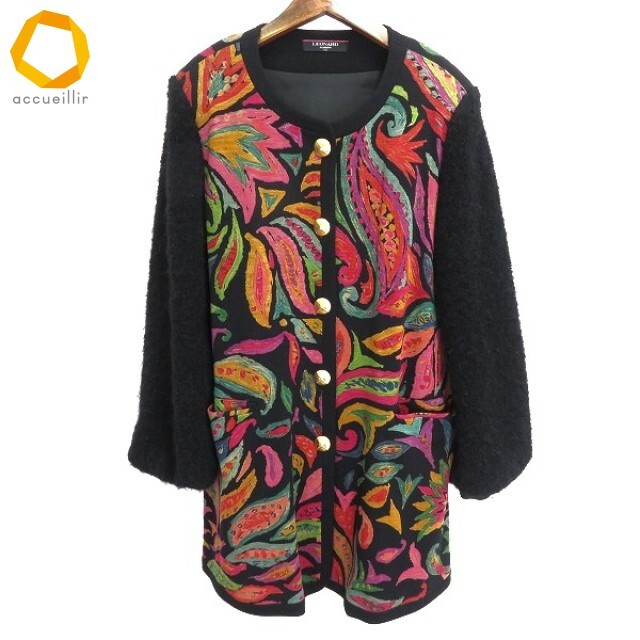 > #w レオナール LEONARD コート 9号 黒 マルチ ボタニカル柄 袖切替 ウール 毛 金ボタン ノーカラー 日本製 レディース [956005] k01