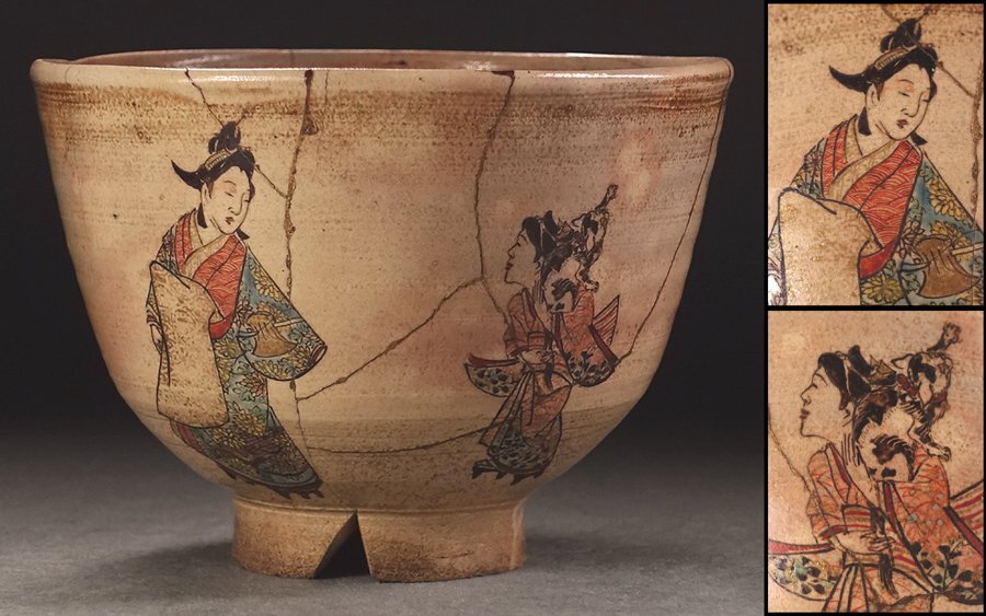 - ∇花∇江戸時代中~後期 仁清焼 色絵花魁図切高台茶碗 猫を抱く禿 赤青の華やかな窯変景色 仁清陶印