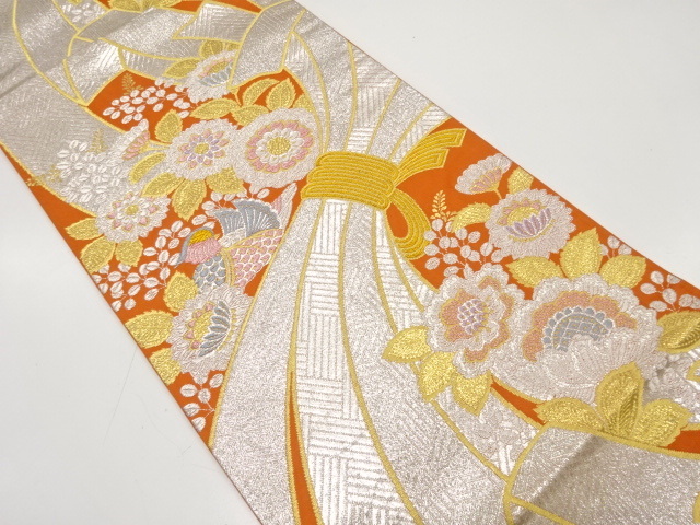 - 美品 束ね熨斗に鴛鴦・菊・萩模様織り出し 振袖用 袋帯 (AAF1K-024)