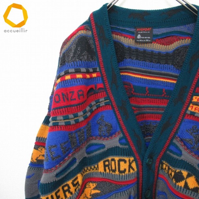 ◎商品名(タイトル):ハイスポーツ HYSPORT 3Dニット セーター カーディガン オーストラリア製 メンズ [x963512ss]◎ブランド名:ハイスポーツ (HYSPORT)◎アイテム名:3Dニット セーター カーディガン◎サイズ:14◎性別:メンズ◎カラー:マルチ◎素材:画像をご参照ください◎実寸サイズ:肩幅約 58.5cm・袖丈約 45.5cm・着丈約 65cm・胸囲約 55cm×2◎商品コメント:★当店の商品はすべてリユースアイテムとなります。特質上、些細なダメージは記載しておりませんので着用に問題のない使用感、着古した雰囲気などはご了承くださいませ。◎コンディションレベル:やや傷や汚れあり◎コンディション備考:右肩に修繕跡がございます。(画像9参照)キーワード/アクイール/古着/used/ビンテージ/ヴィンテージ/昭和/レトロ/ピュアウール