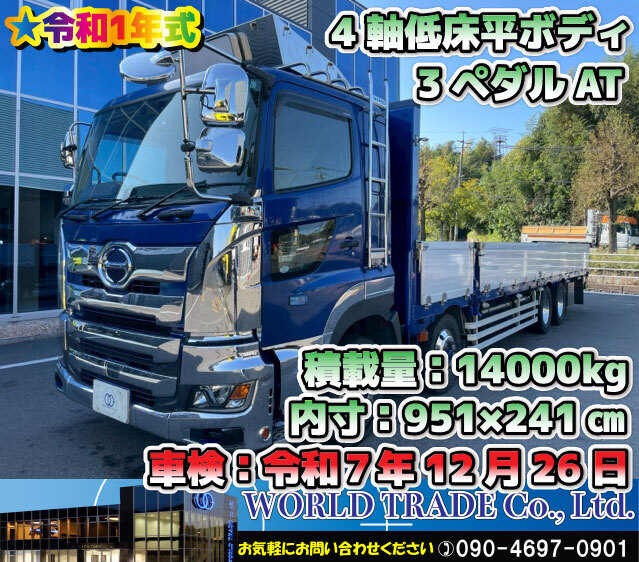 > 日野 4軸低床平ボディ 令和1年式 3ペダルAT 積載量:14000kg 車検:令和7年12月26日