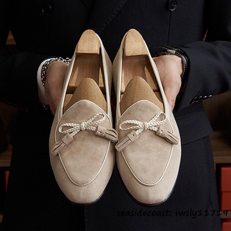 - 定価10万■最高級 ビジネスシューズ スエード革 職人手作り 本革 レザーシューズ タッセル ローファー 紳士靴 革靴 牛革 カーキ 27.5cm