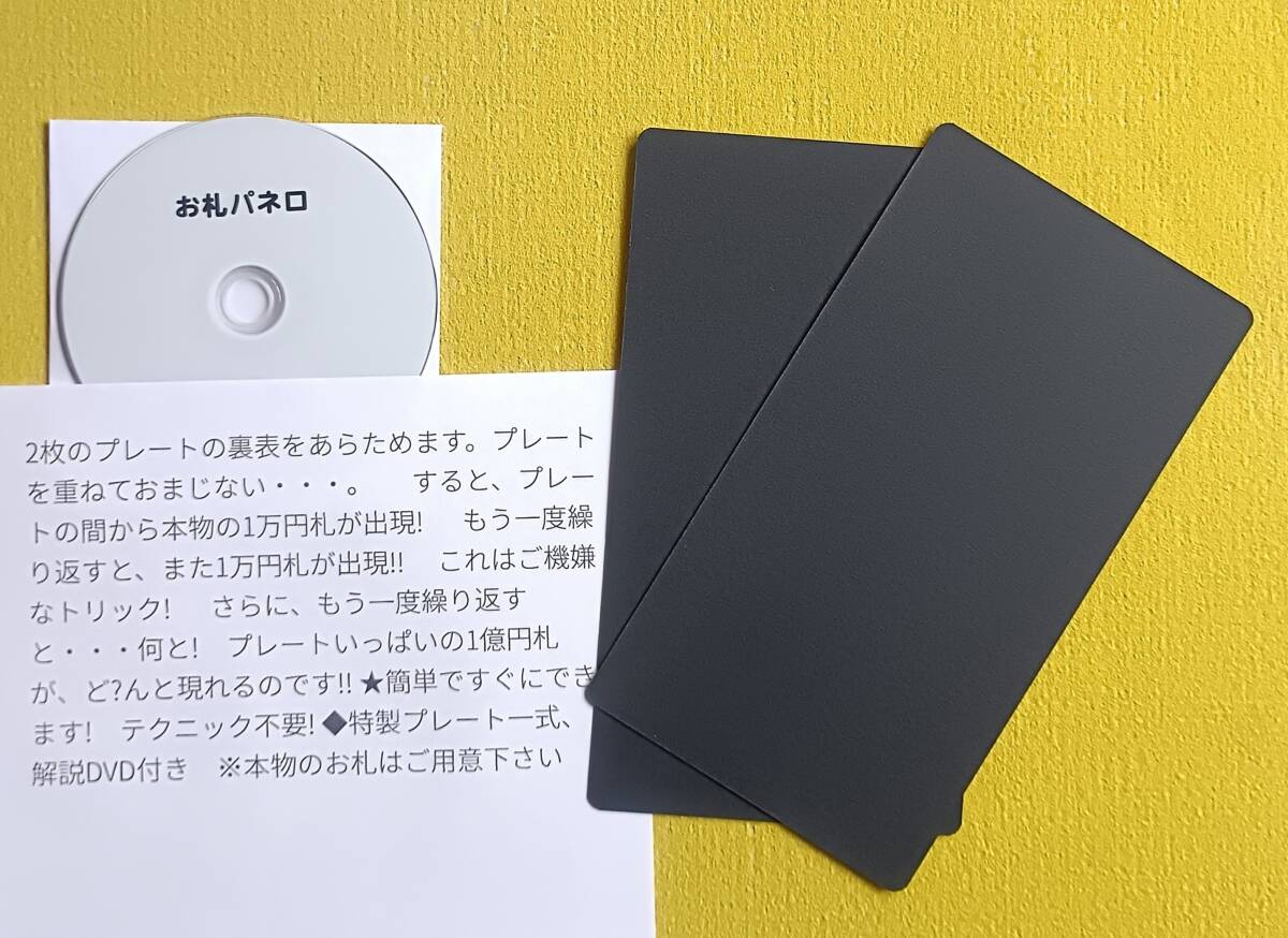 - ★《お札パネロ》2枚のプレートにおまじないをかけるとプレートから本物の一万円札が2度もさらに大きな一億円札が出現する
