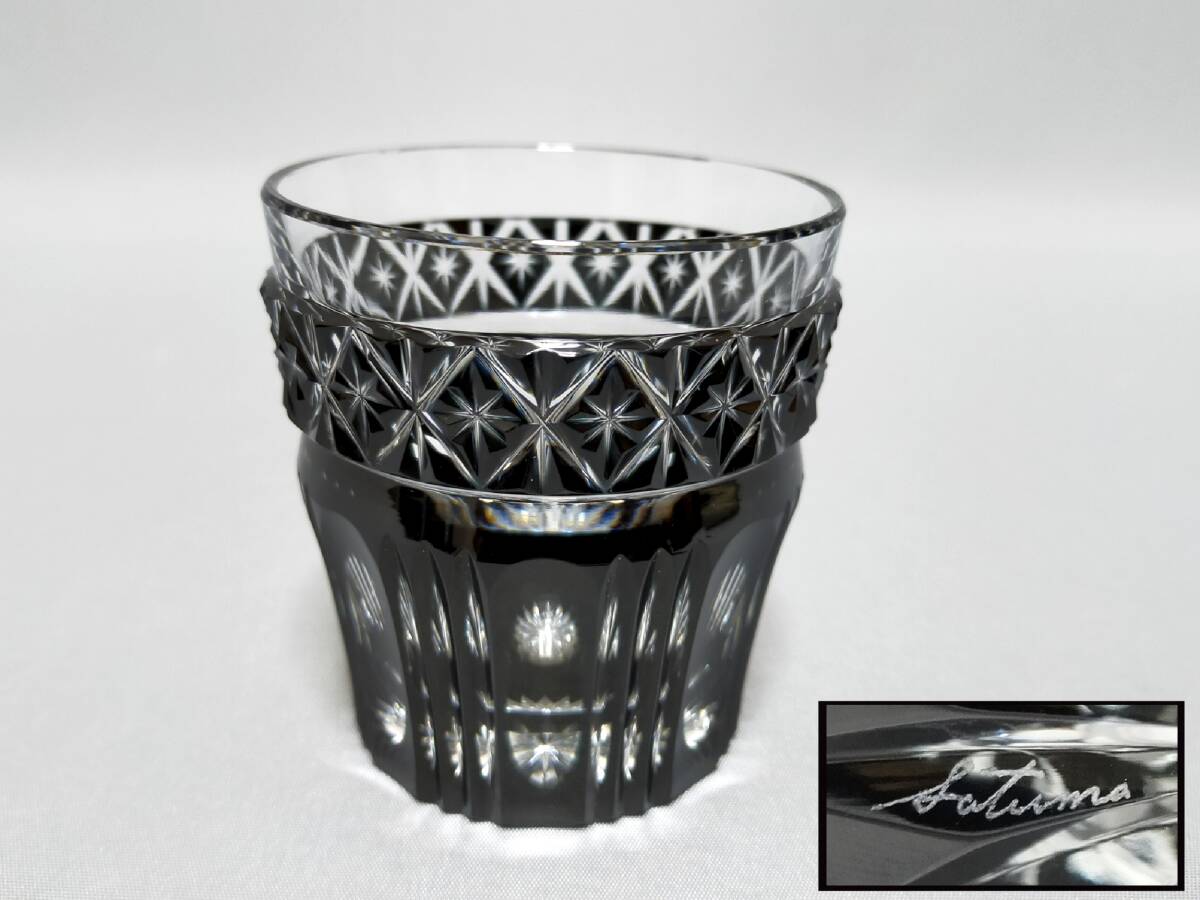 - TN28 薩摩切子 酒器 グラス 薩摩びーどろ工芸 作 黒切子 オールド 高8cm ぐい呑 ロックグラス