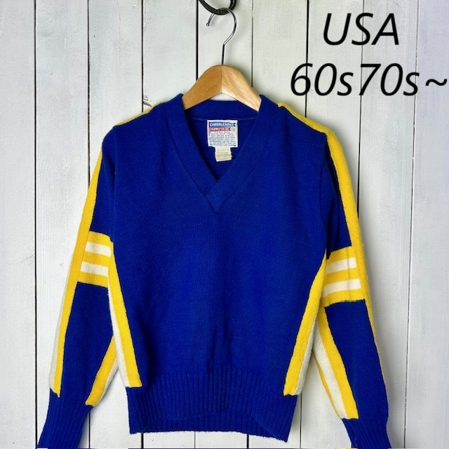 > USA古着 60s70s~ ライン切替え チアリーダー ニットセーター 34 青 短丈 アクリル ヴィンテージ アメリカ チアリーディング カレッジ●306