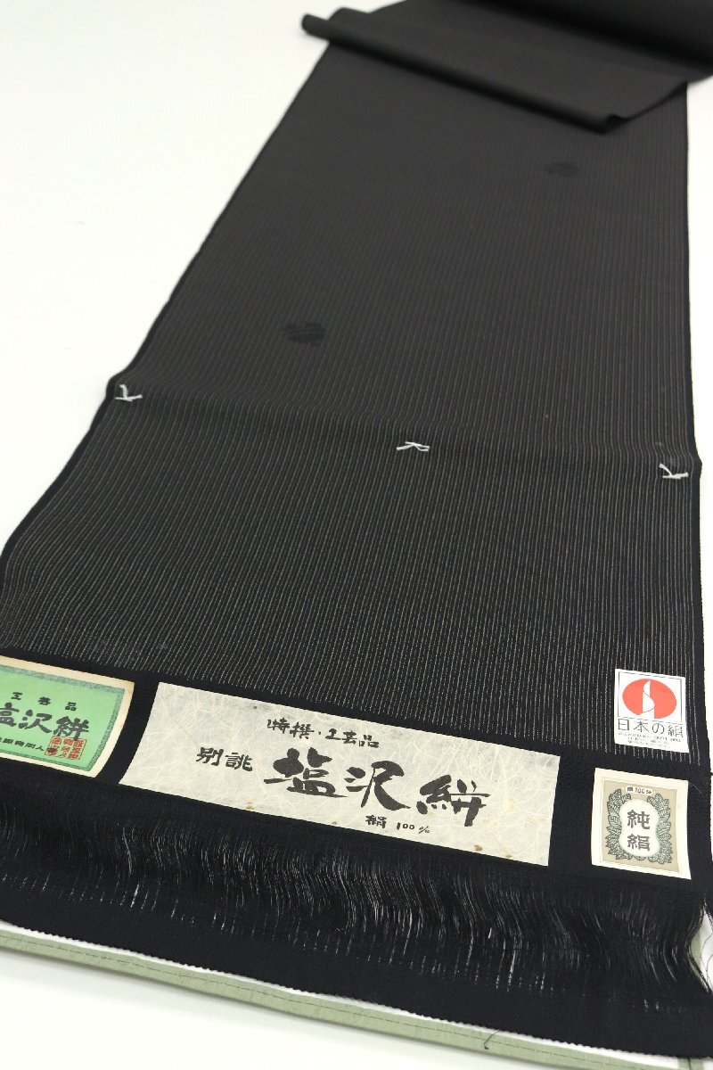 ※こちらの商品にはお仕立てはついておりません。 (布幅:37.5cm) 工芸品塩沢絣着尺をご紹介致します。 ややシボ感のある風合い豊かな紬地は、黒色のお色目でございます。 絹鼠色の縞で鈴文が表現されており、可愛らしくお洒落な印象でございます。 -状態・素材:新品 未仕立 正絹 -落款・証紙:越後織物同人会工芸品塩沢絣の証 -参考着用年代: 30代~幅広い年代でお召しいただけます。 -着用時期 :10月~5月