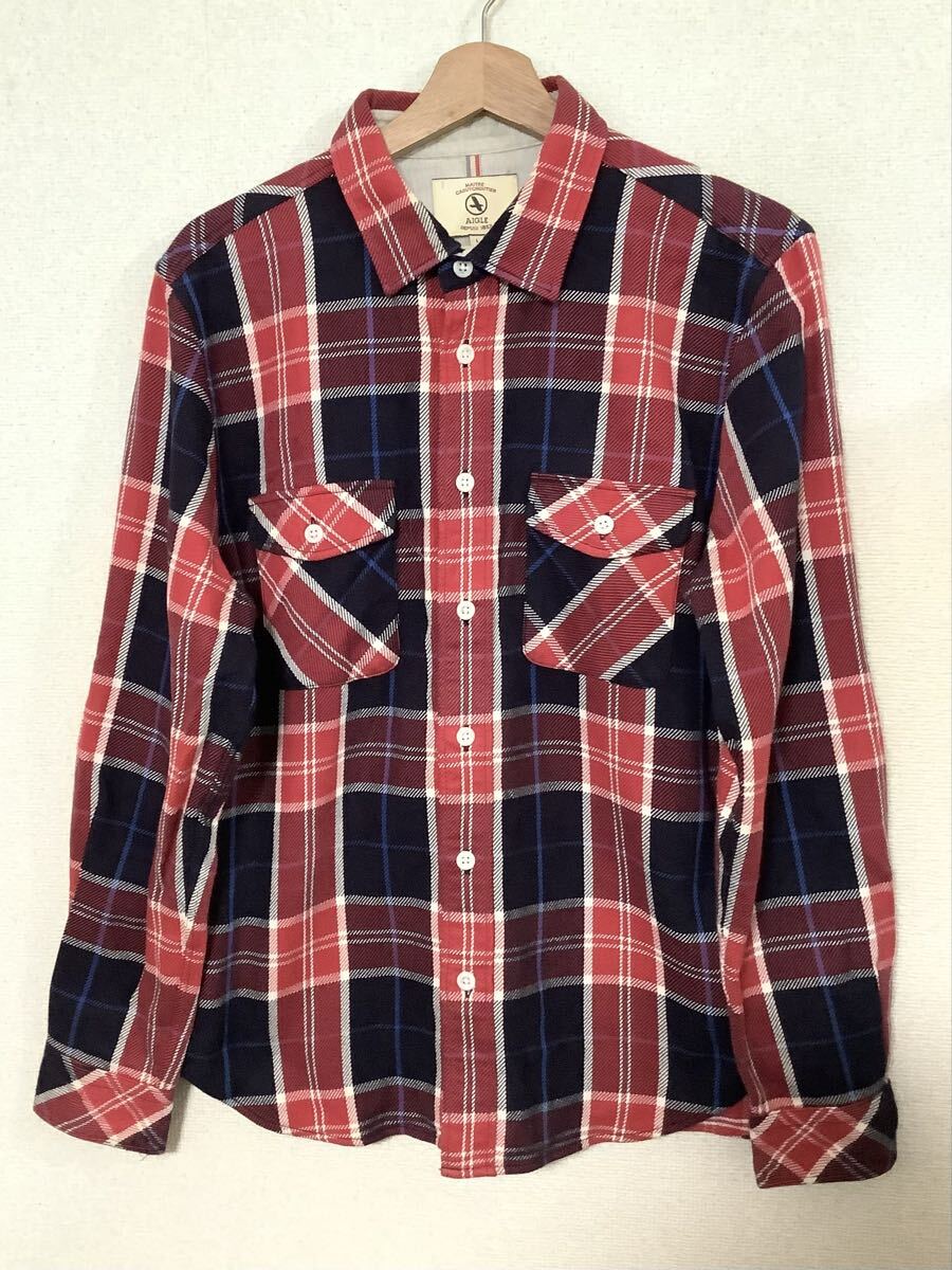 > AIGLE エーグル チェック ネルシャツ コットンシャツ 長袖シャツ レッド アウトドア カジュアル メンズ L