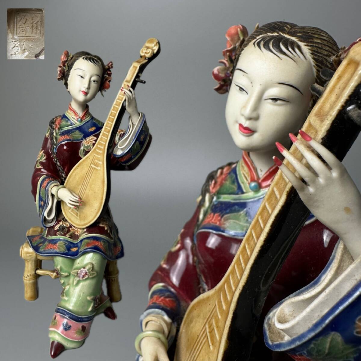 - コレクター買取品 中国美術 中国石湾名家 林乃河 美女像 仕女 五彩陶器人形 弦楽器 唐物 在銘 極上彫 細密彫刻 中国古玩 飾物 置物 時代物