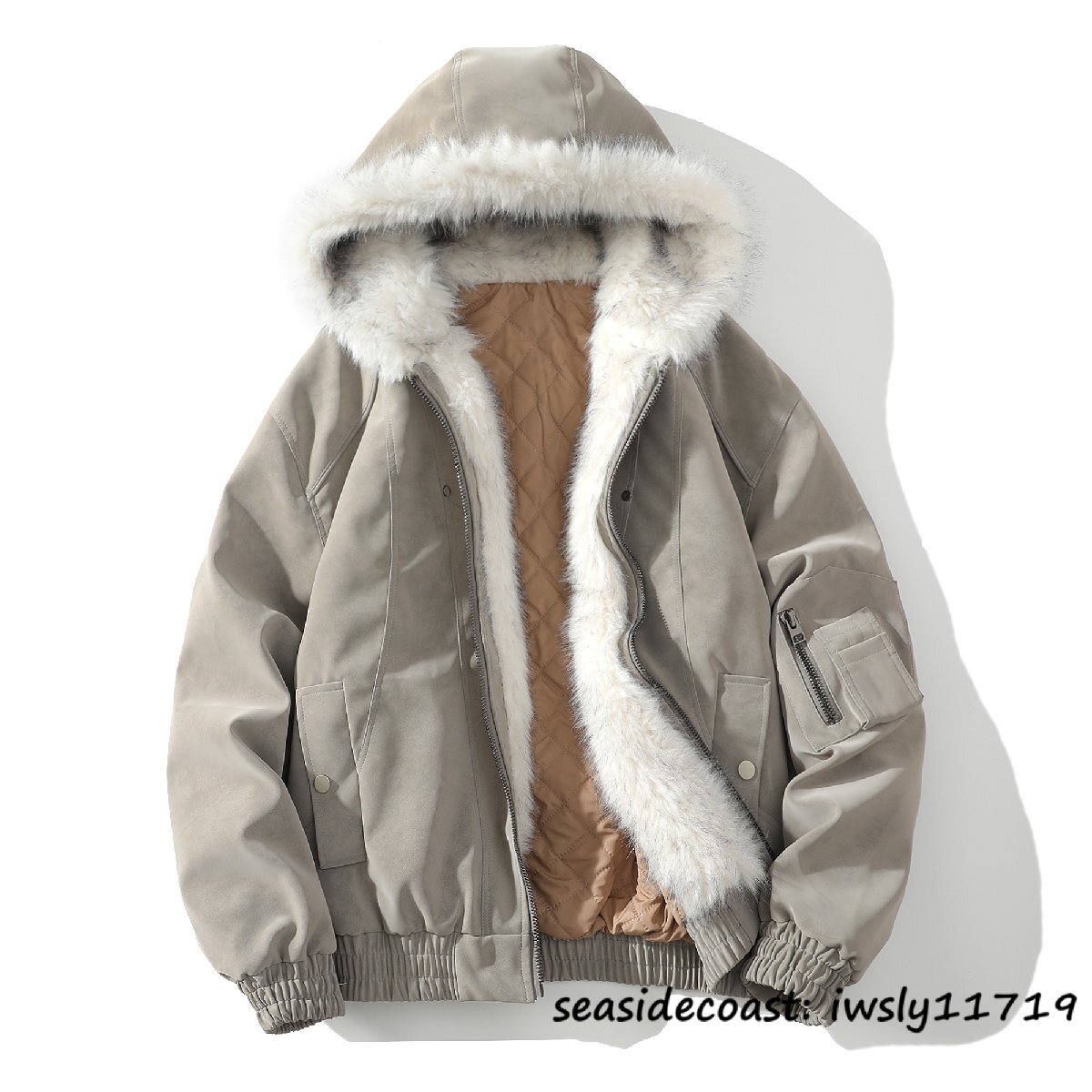 - 超美品★ブルゾン メンズ 保温 防寒防風 厚手 ファーコート フード付き 秋冬 ムートンコート パーカー アウター ジャケット グレー L