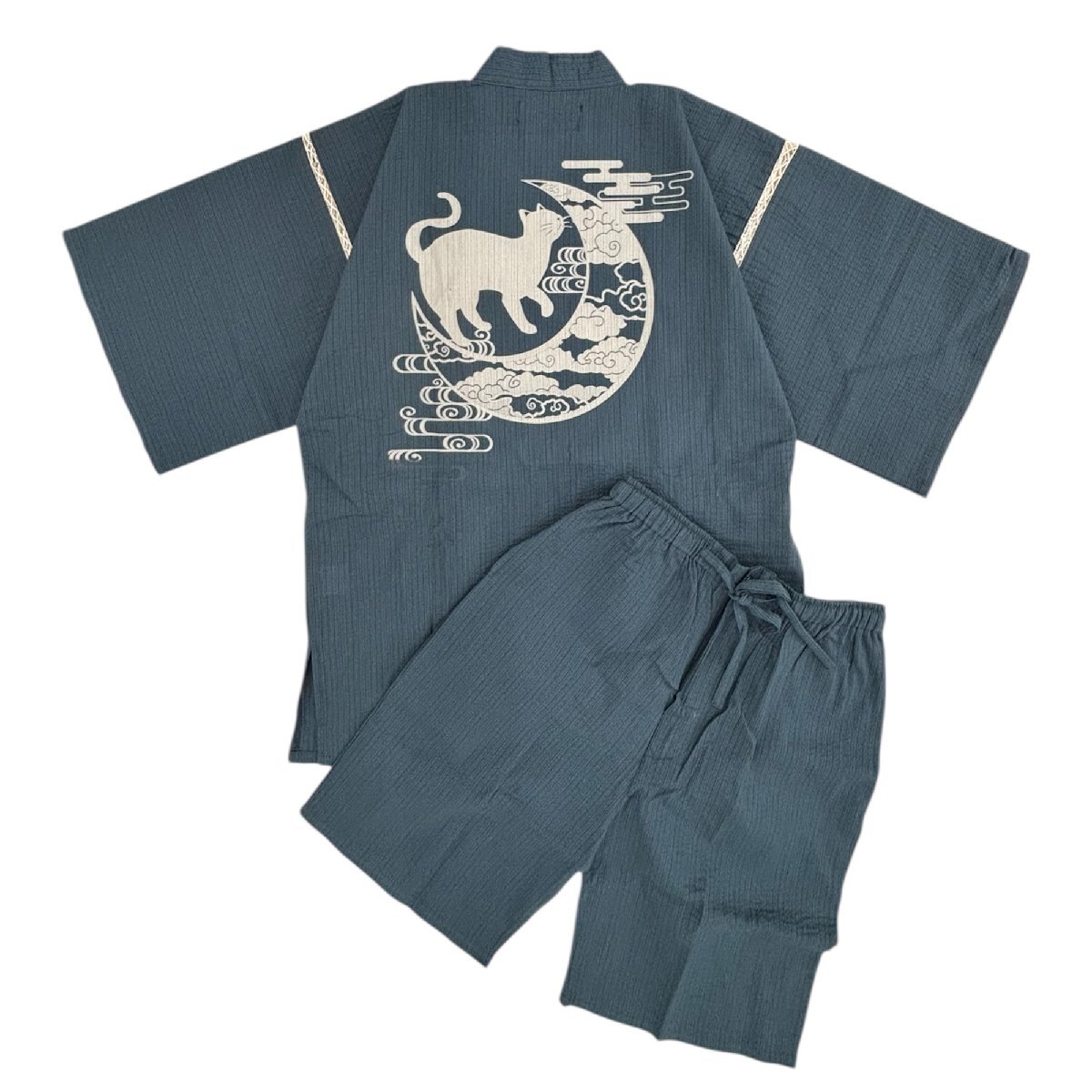 - [江戸てん]訳あり半額 甚平 しじら織り 涼しい 綿100% 抜染 メンズ 猫と月雲 M 紺