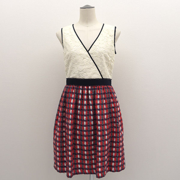 > ★ チェスティ ノースリーブワンピース 花刺繍 チェック柄 ホワイト×レッド 1 タグ付き 6A529 (0220536218)