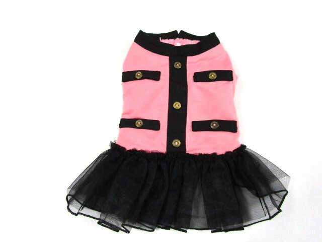 - ペットウェア Mサイズ 胴回り38㎝ ノーカラージャケット風ワンピース ピンク・ブラック 中古